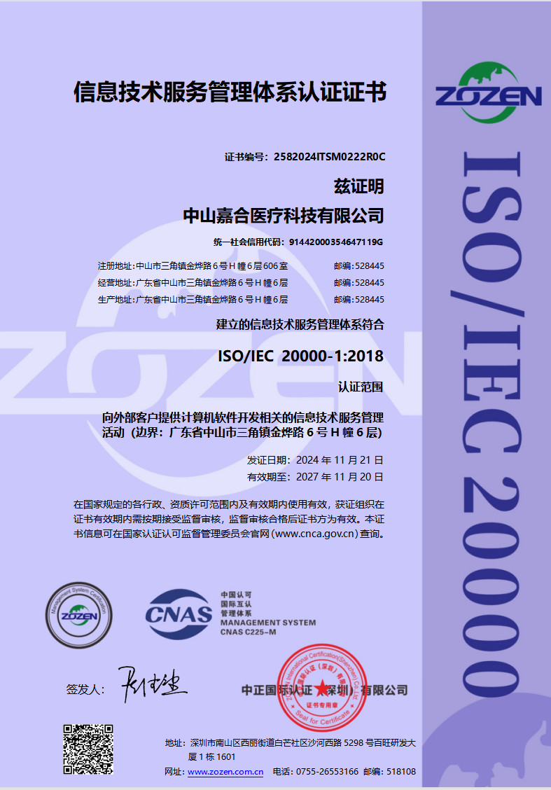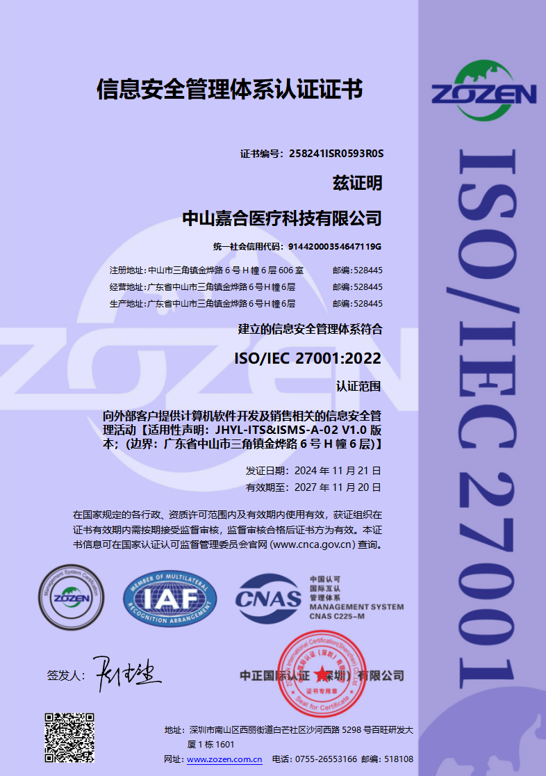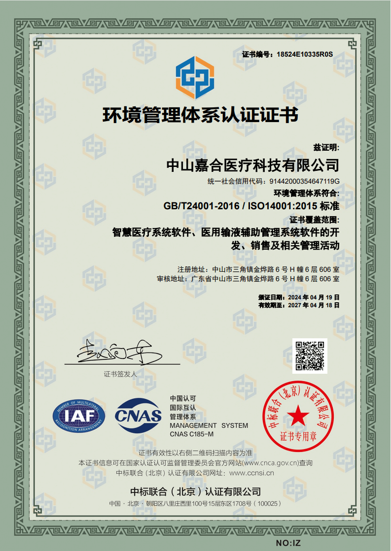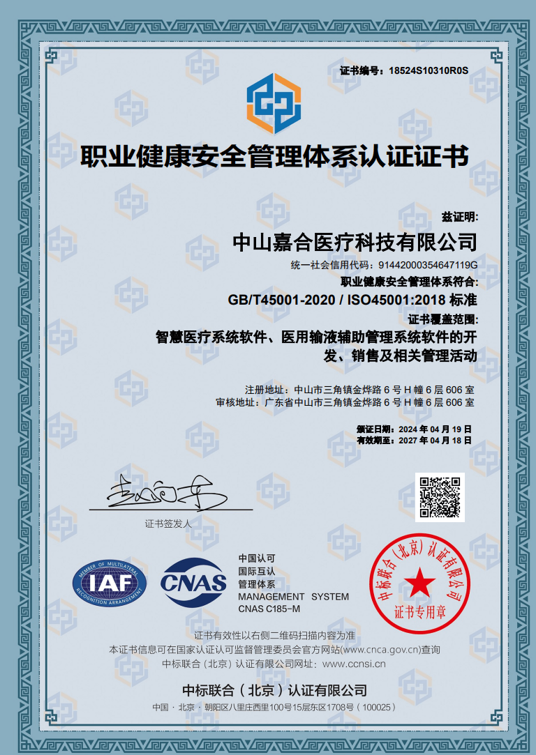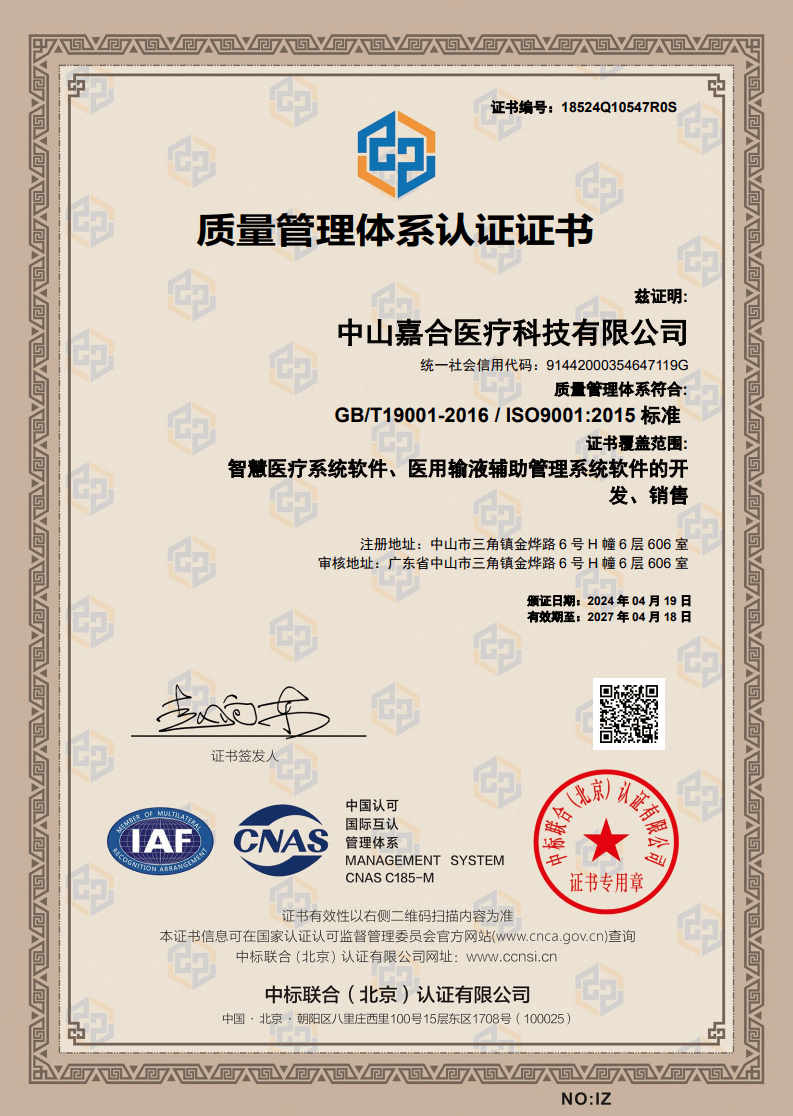 中山嘉合医疗科技有限公司成立于2015年8月14日,主要从事研究开发医用输液辅助管理系统,运用物联网技术实现数学化输液远程看护,自动换药的功能。实现输液全程无液自检,程序化开启和关闭输液管道,远程控制。从日常护理工作流程和临床输液准则出发,减轻护理工作者工作强度,加强病人人文关怀。