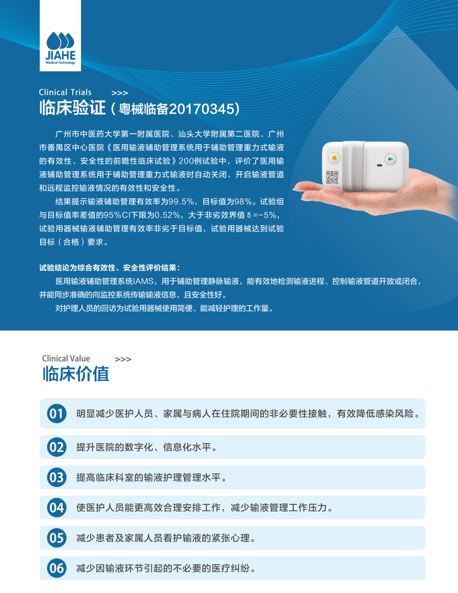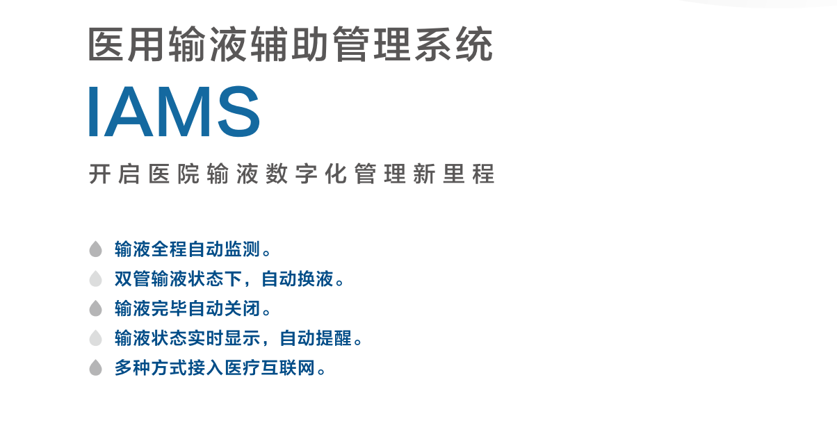 静脉输液是现代临床医疗中门诊、病房最主要的治疗手段,但护理工作者事务繁多且要求细致不出错,导致病人情绪不安、医患矛盾加重、医疗投诉众多,故在不能增加护理人员配置的客观情况下,本公司的科研团队自主研发设计出数字化智能化的医疗设备——医用输液辅助管理系统,简称IAMS系统。