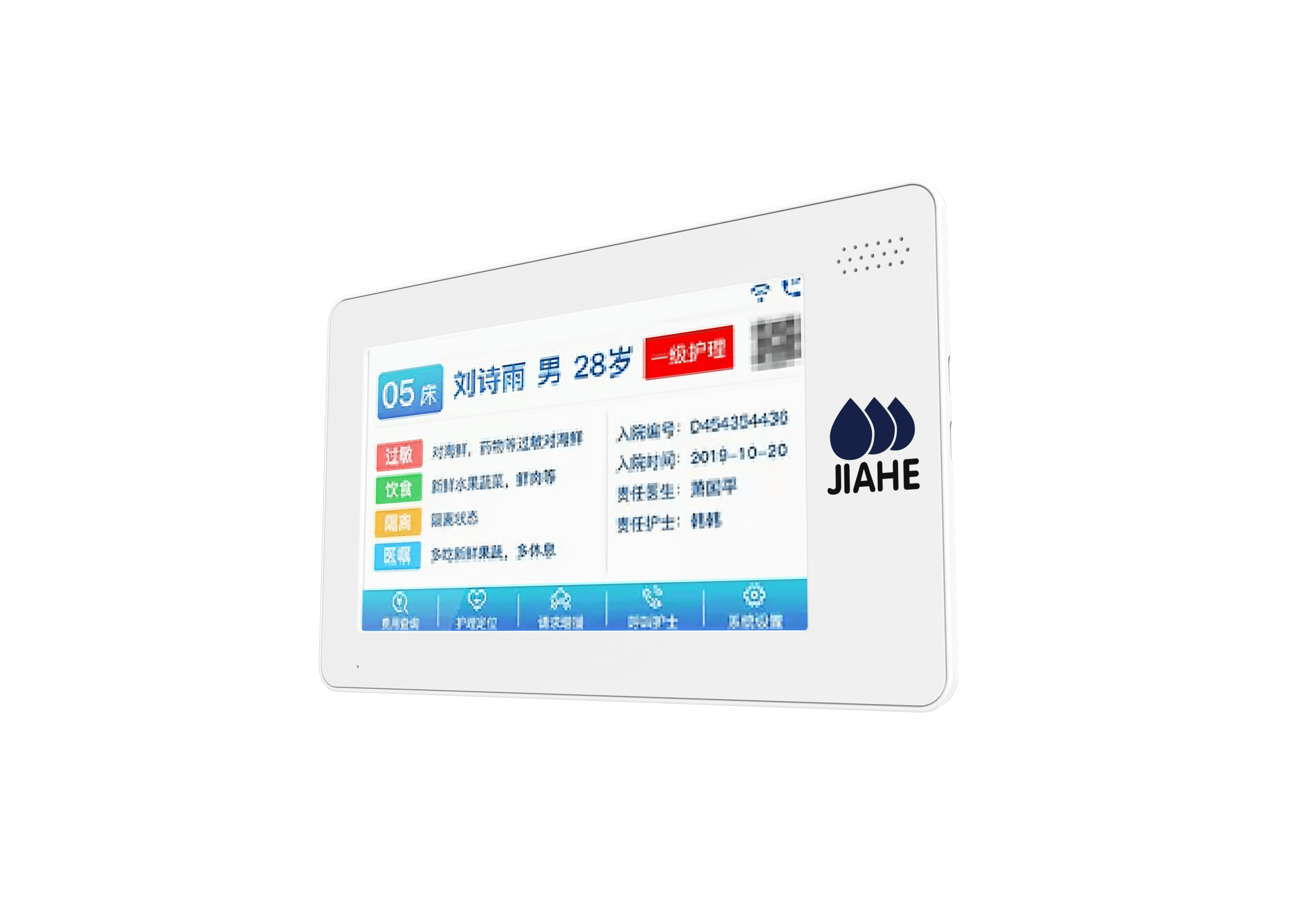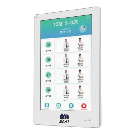 医护主机与病房内床头屏,可实现护患之间的可视对 讲,提高工作效率的同时,为患者提供更加周到的护理服务。 提醒功能:病患呼叫提醒、护理提醒、轻触屏幕呼叫界面可 挂断并取消呼叫。 信息推送:可管理智能电子床头屏系统,可推送信息。 通讯功能:可和患者智能电子床头屏进行高清对讲 监护功能:医护主机显示病患的多个信息,可实时监护并 预警。