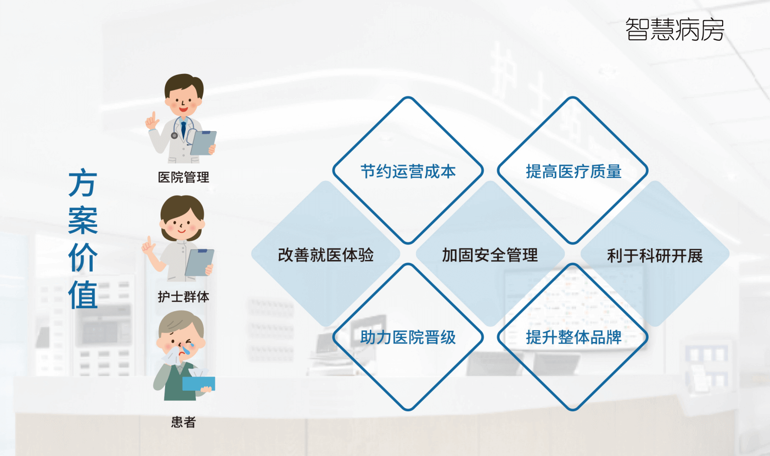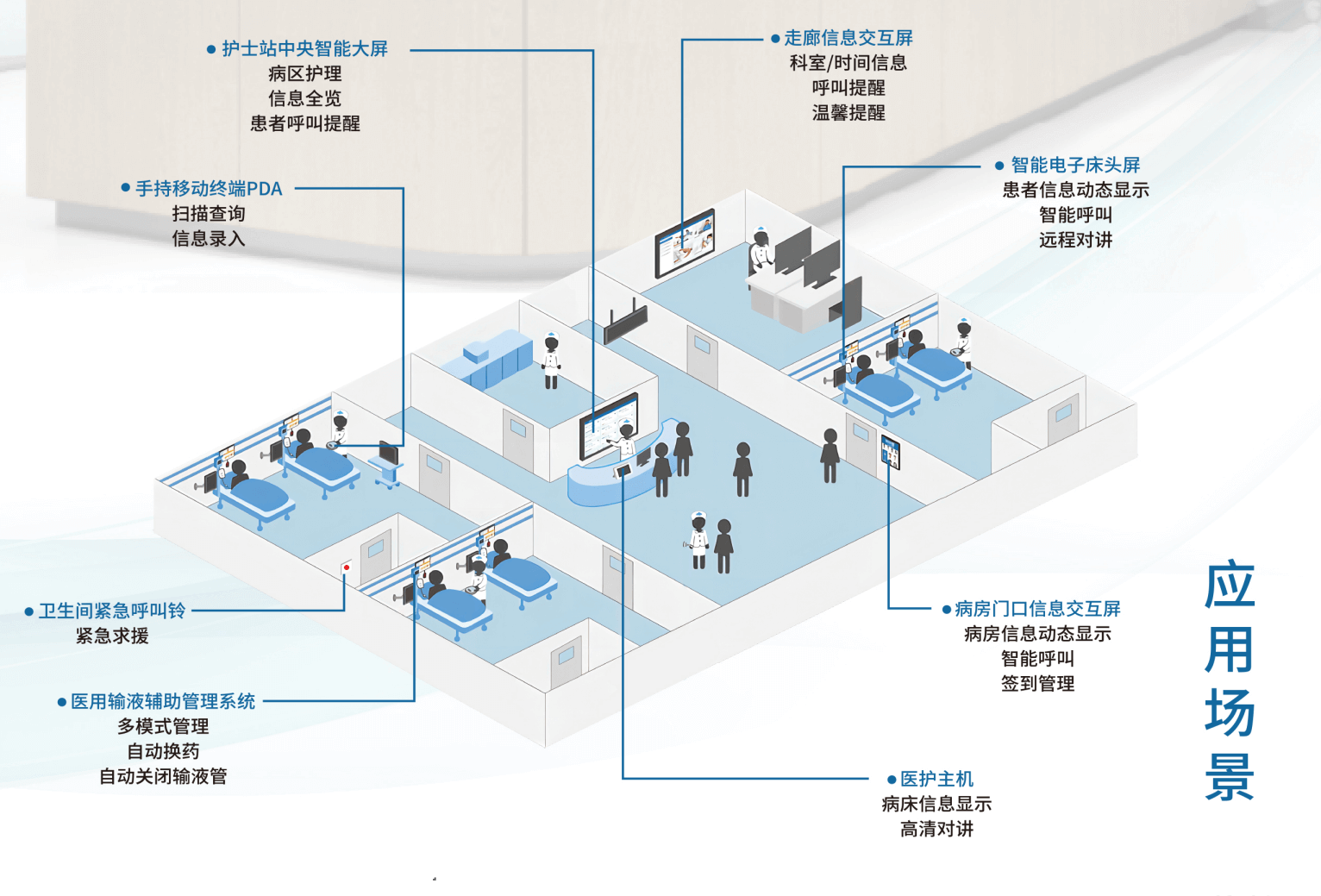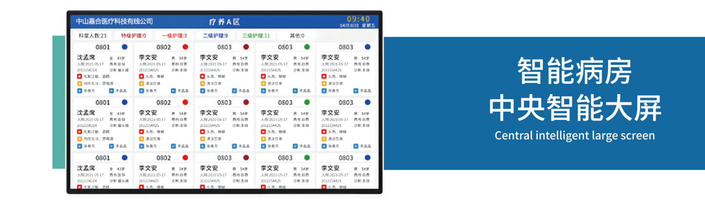 护士站中央智能大屏是整个病区的信息中心,实时呈现 患者信息、医嘱信息、手术信息、护理计划与执行情况等,所有 信息一目了然,还可随其它系统的信息变动实时更新,强化交 班功能,提高工作效率。 科室全览:整个科室状态和数据一目了然,全科室床位动态 信息一览(护理等级、危重情况、输液情况等) 信息查询:可查询患者基本信息、医嘱信息、科室排班、护士 管床等信息。设备信息推送和信息管理:接受院方通知、 病患呼叫和护理提醒等。